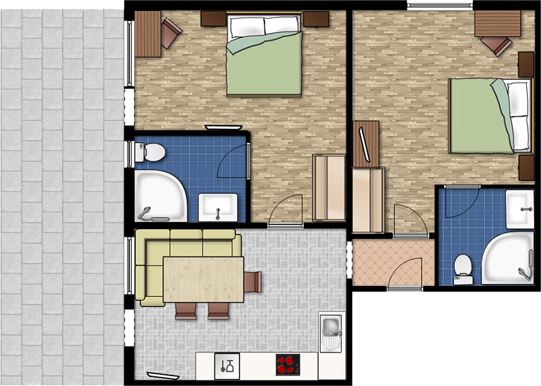 Dieses Appartement befindet sich im Erdgeschoss (Hanglage gebaut) und verfügt über einen 32 m² großen, möblierten Balkon. Von dort aus genießen Sie einen wunderbaren Panoramablick auf die umliegende Bergwelt.